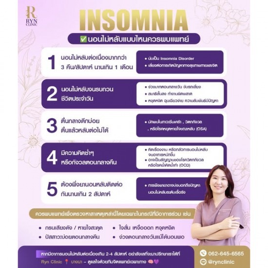 หากมีอาการนอนไม่หลับต่อเนื่องเกิน 2-4 สัปดาห์ อย่าลังเลที่จะมาปรึกษาเรา ริณคลินิก Ryn Clinic บางนา-บางแก้ว แก้อาการหลับยาก แก้ปัญหานอนไม่หลับ หลับไม่ลึกรู้สึกตัวตลอด ตื่นง่ายหลับไม่พอ แก้ตรงจุดจากสาเหตุโดยตรง ดูแลใจด้วยทีมจิตแพทย์ ผู้เชี่ยวชาญเฉพาะทาง